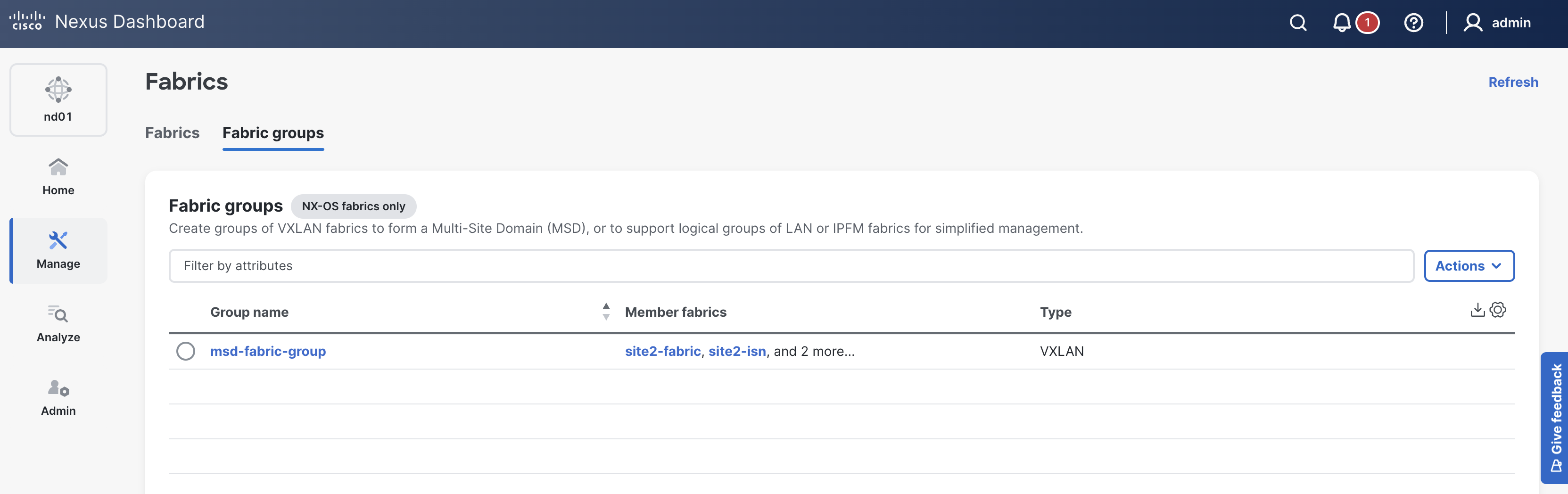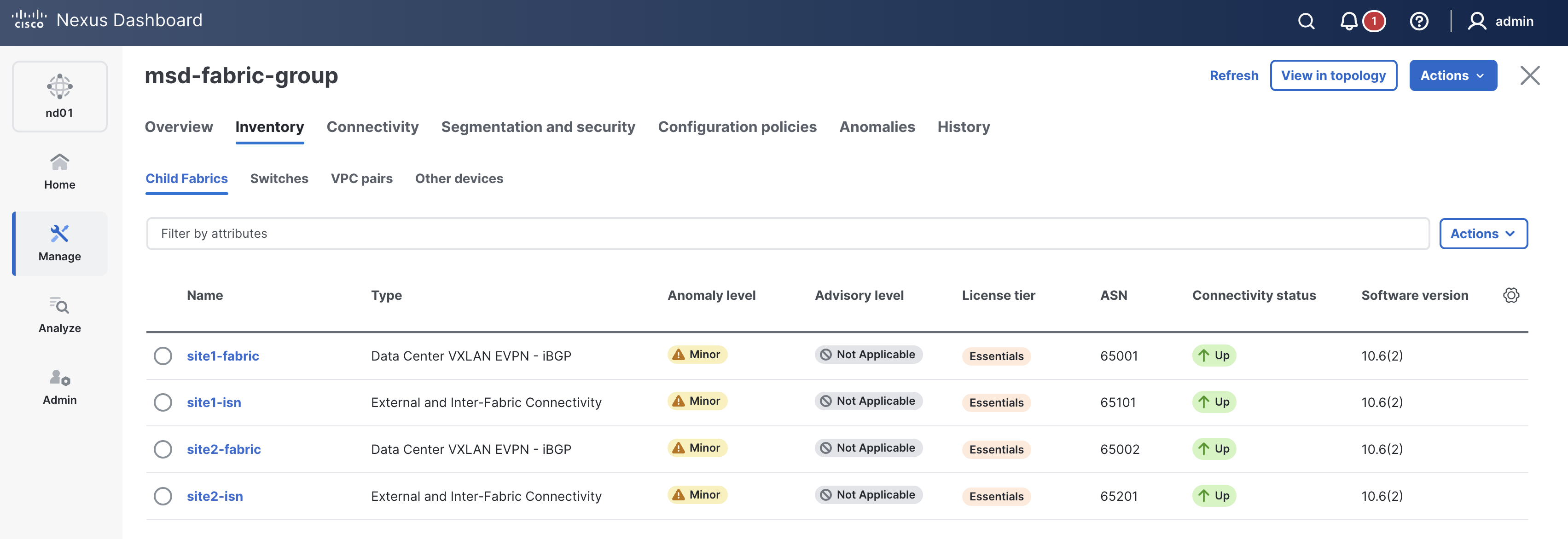 Please continue to the next section to start managing your overlay from the Multi-Site (MSD) fabric group level now.