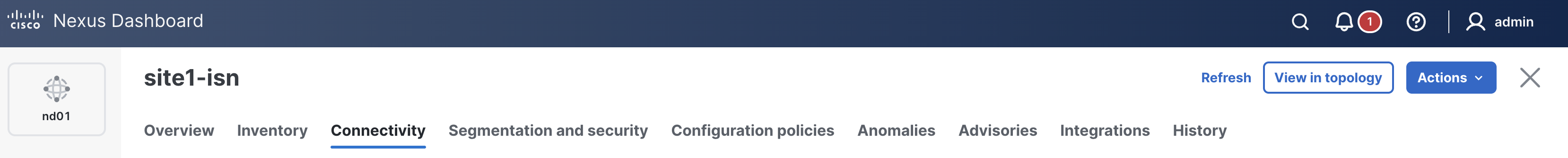 Like previous fabrics, Site1 ISN will leverage the same ND group and ND instance, but specify the Site1 ISN fabric as a logical host.