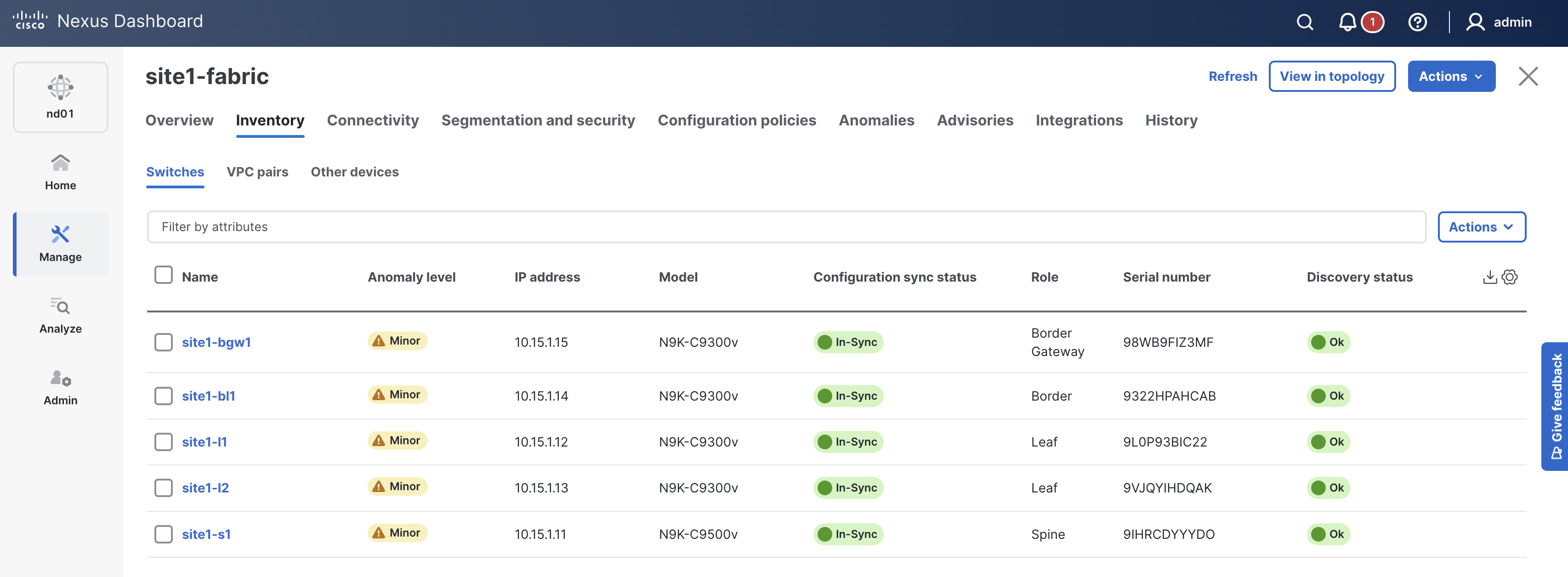 Here you will start to see the spine and leaf devices being discovered and added to the site1-fabric fabric.