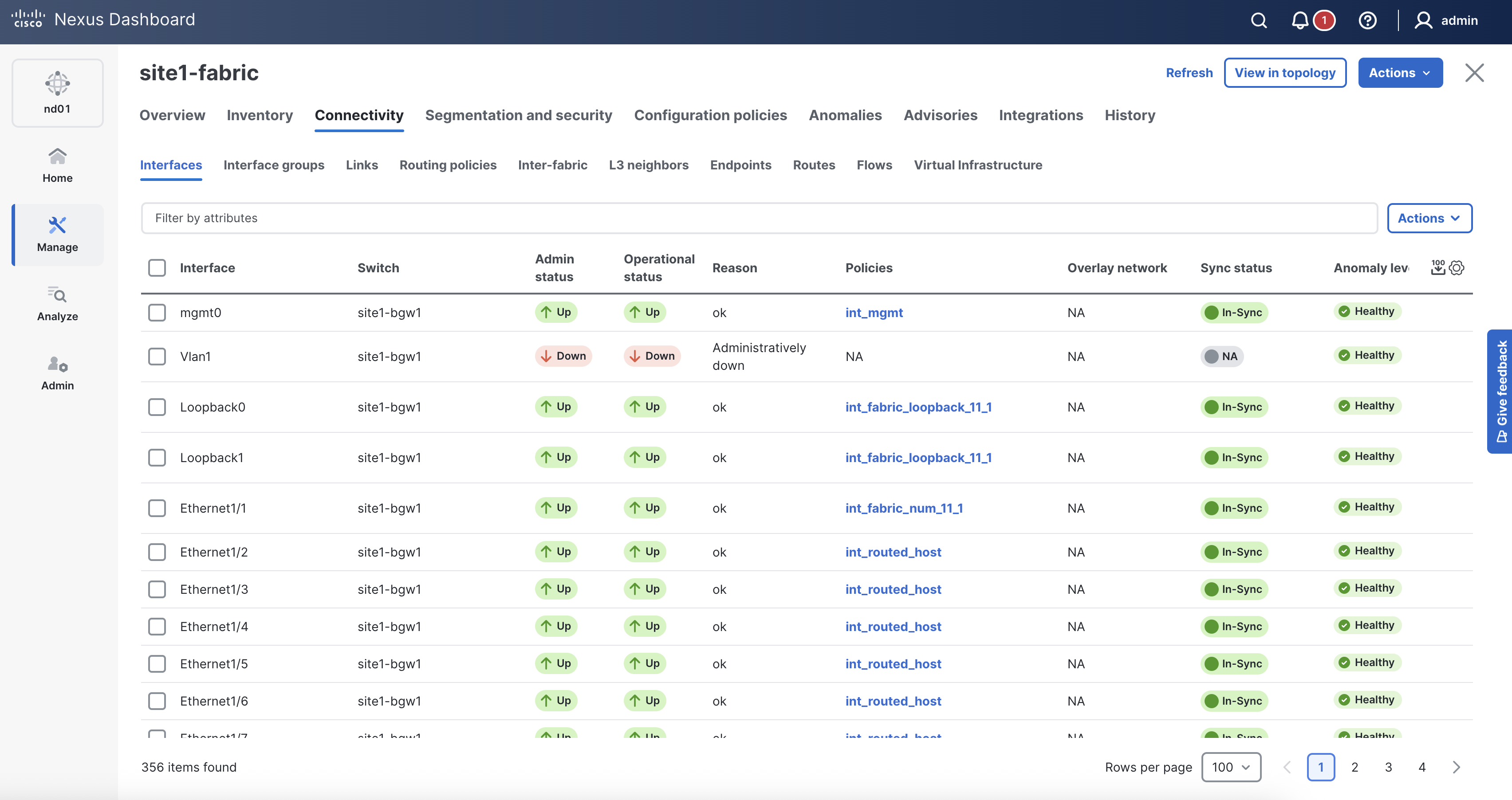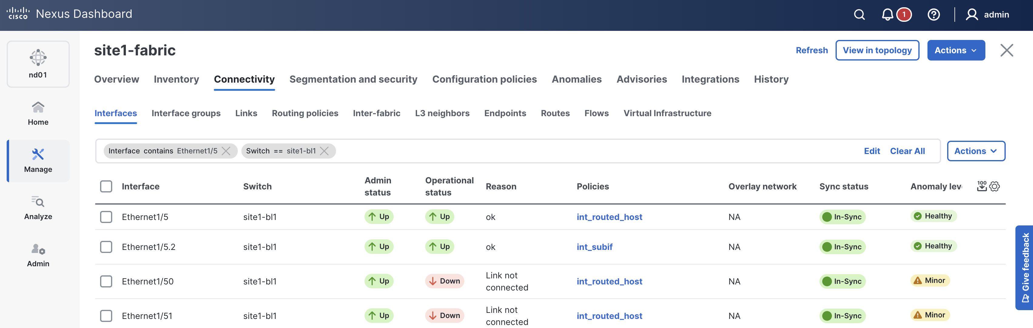 When reviewing the Interfaces tab, it is expected to see the interfaces for site1-bl1 now.