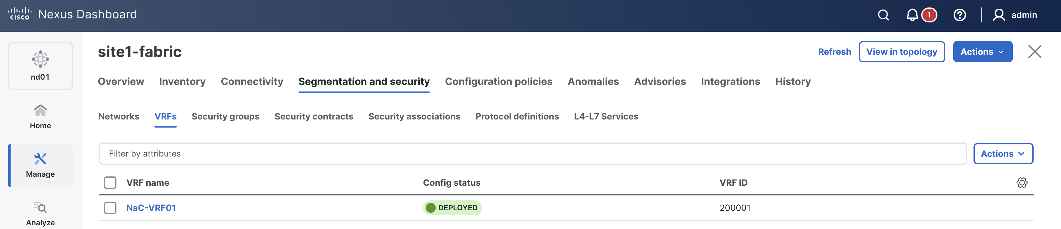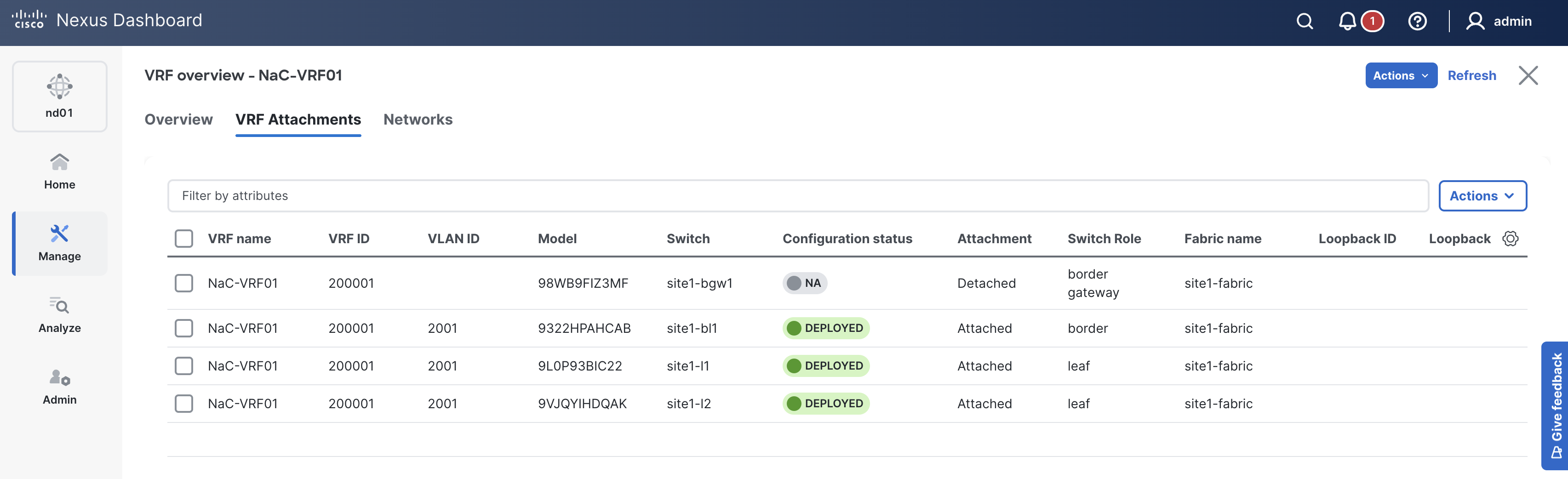 To configure VRF-Lite in your Site1 fabric, update your vrfs.nac.yml file to include the border leaf switch in the VRF attach group.