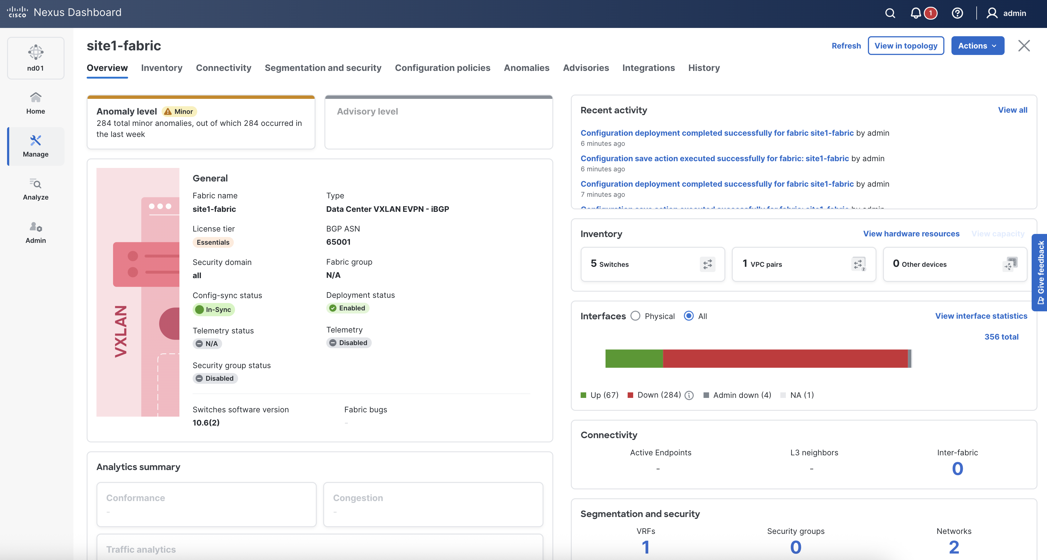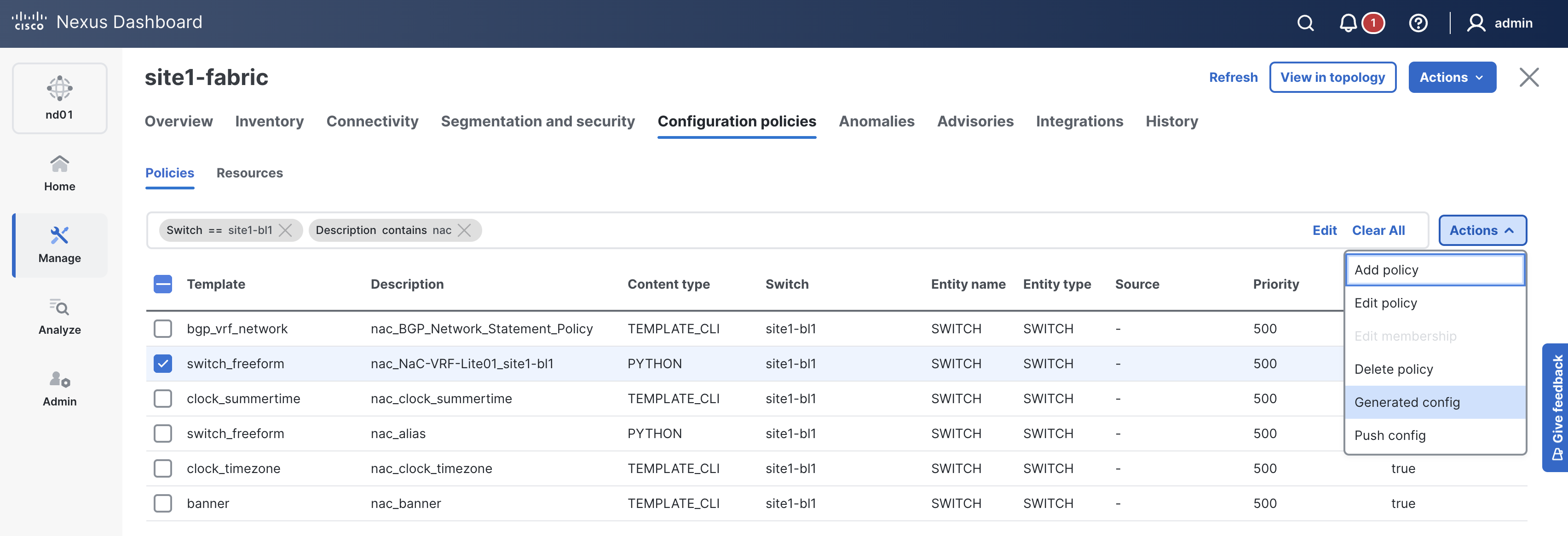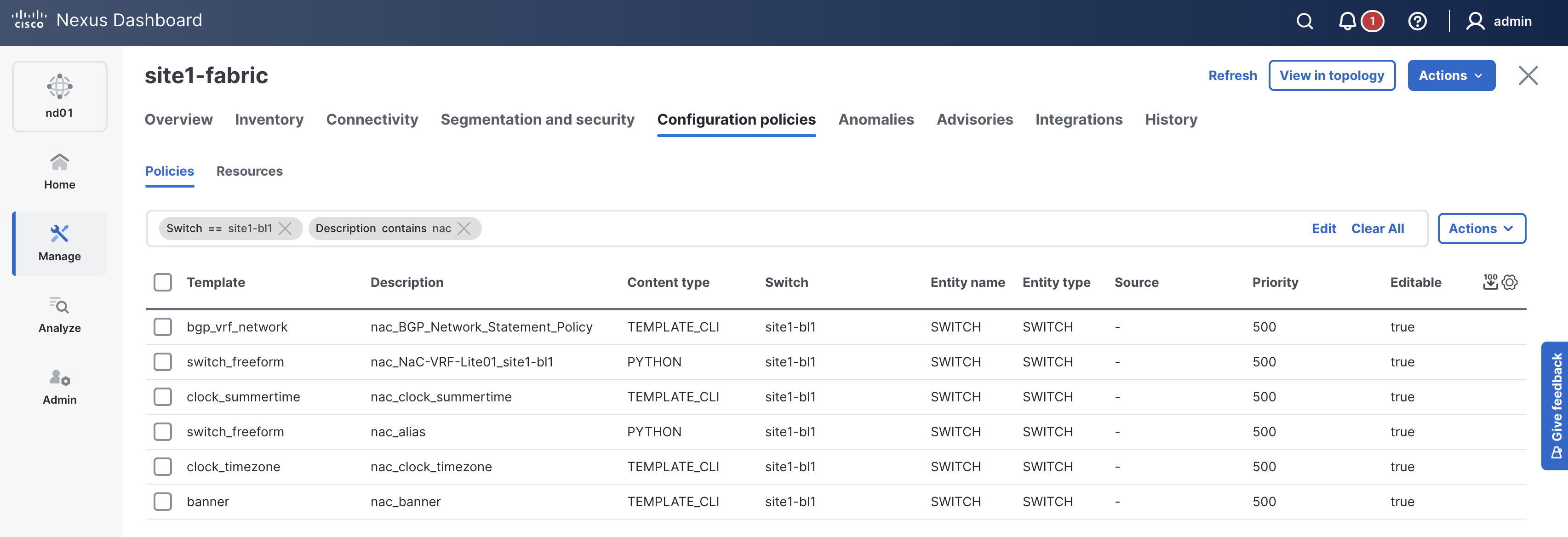 In the previous sections, you created several YAML files that defined the fabric, global configuration, underlay configuration, topology and