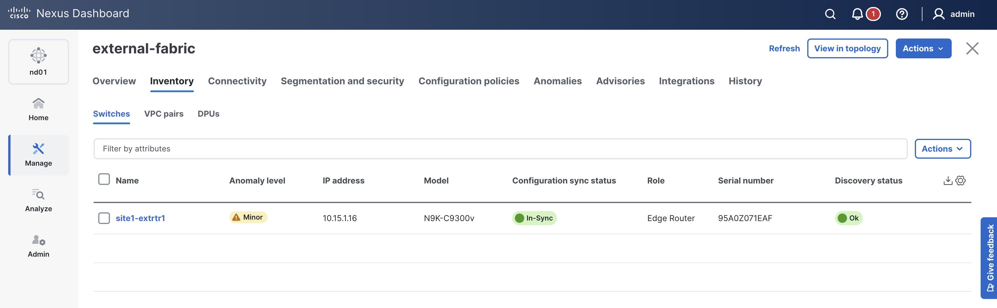The end goal is to establish a connection between the site1-fabric and the external router in the external-fabric,