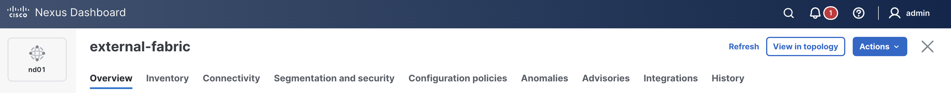 This external fabric will be used to connect an external router, which is represented by the site1-extrtr1 device in the diagram to the right.