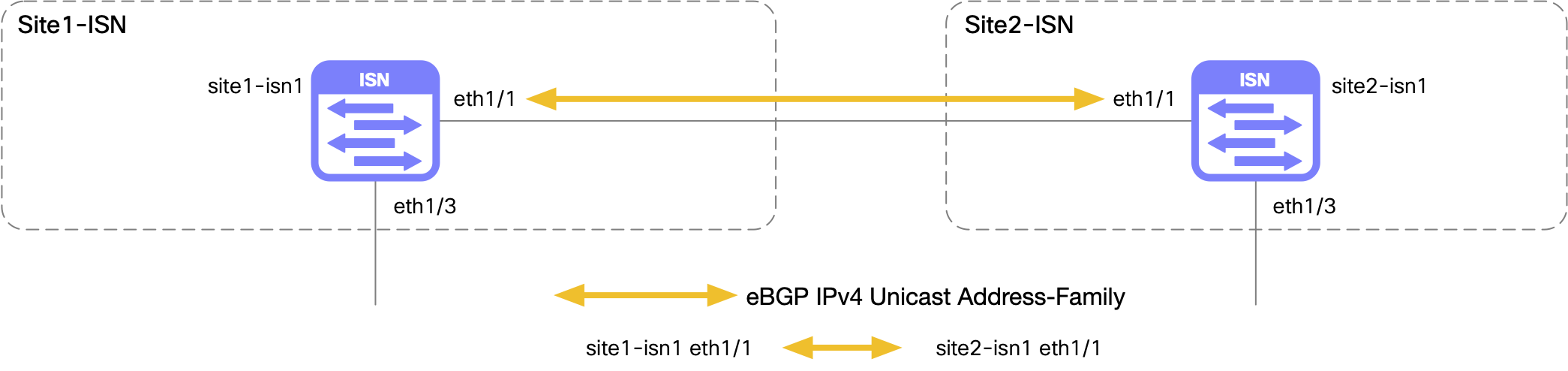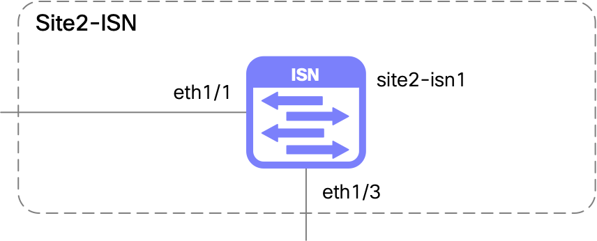 You still define the topology of the fabric switches, interfaces, and policies as before. The interfaces defined on the ISN switch include a loopback interface for the route server and a routed interface to connect to Site1 ISN. In the policy section, an external BGP neighbor policy is defined to peer with Site1 ISN using an ND policy template. With regards to interface Ethernet1/3 in the diagram, this interface is not defined in the data model as the settings you will use for Multi-Site (MSD) will be applied automatically by ND when the Multi-Site extension is enabled later in the lab.