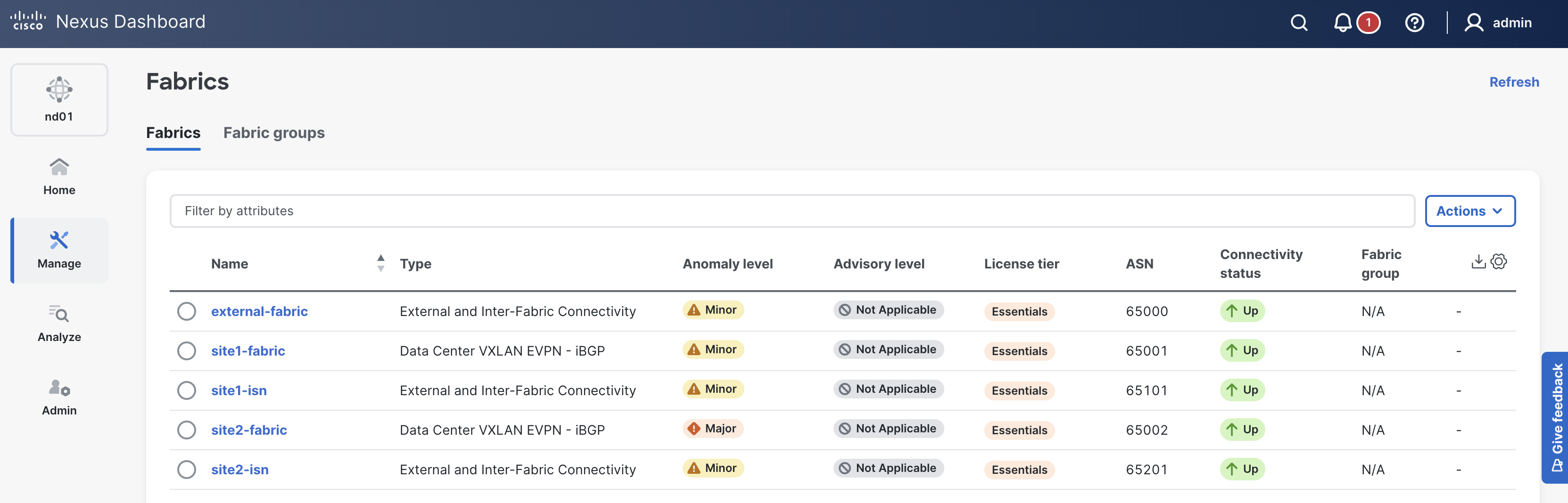 Please continue to the next section to model and bring all your fabrics into a Multi-Site (MSD) fabric group to manage overlay extensions between sites.