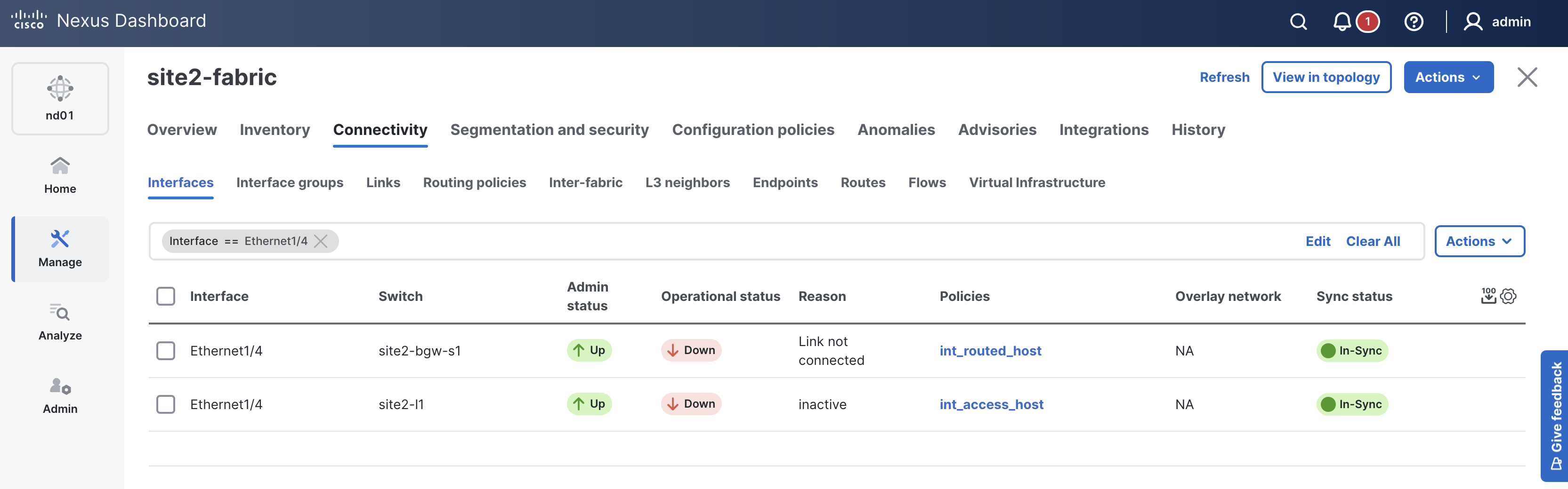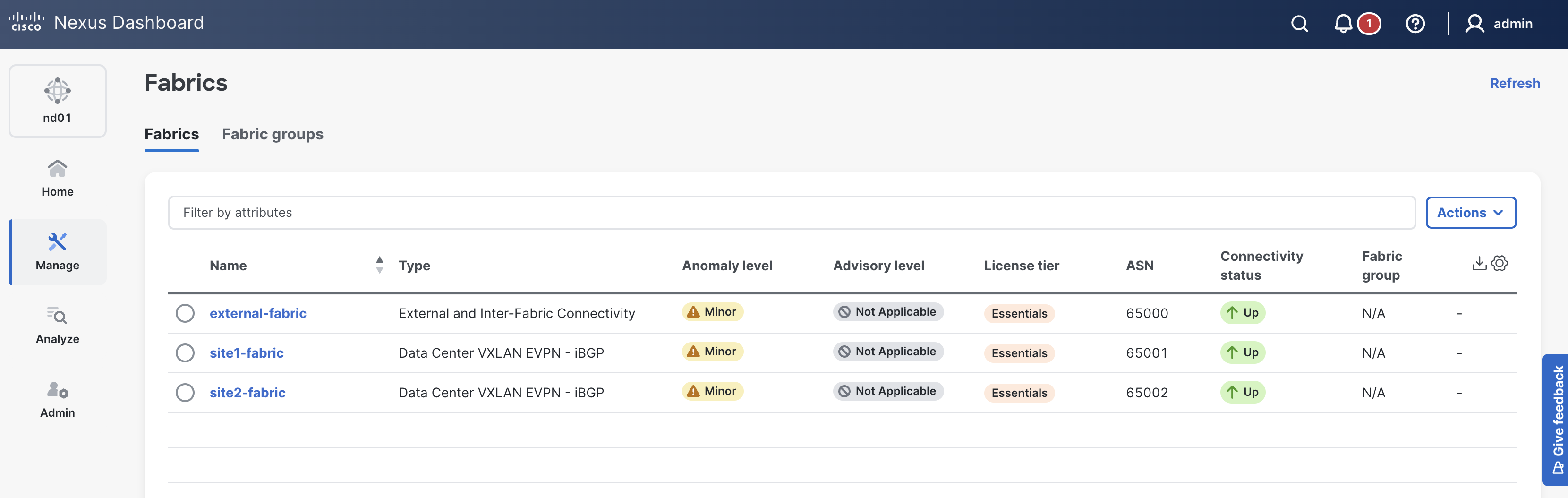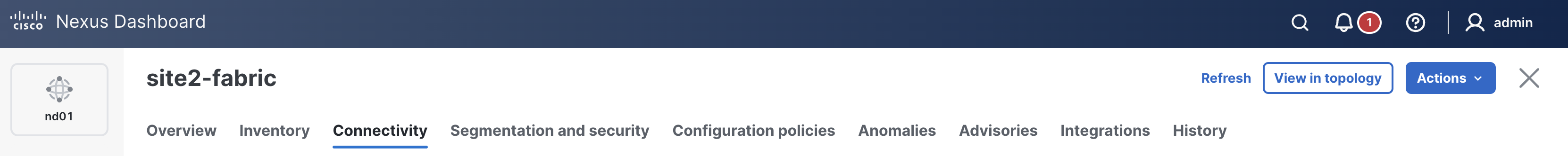 Please continue to the next section to create your Site1 ISN fabric, onboard an ISN switch, and configure the necessary policies to establish BGP peering between sites.