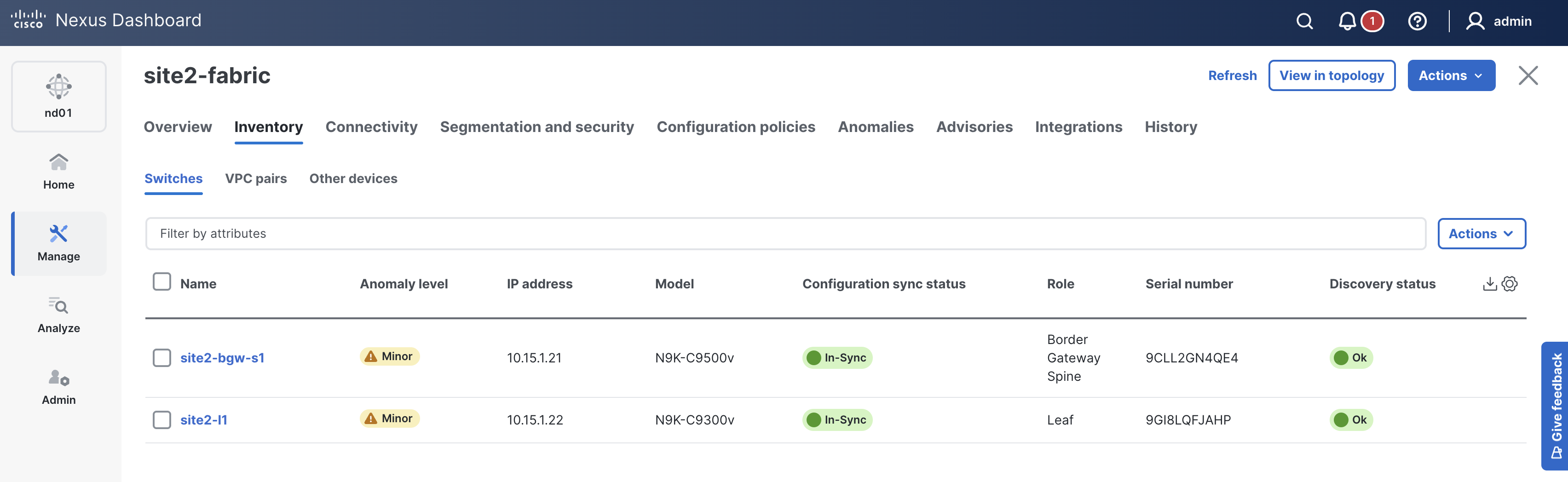 # Inventory Information For Site2 Fabric