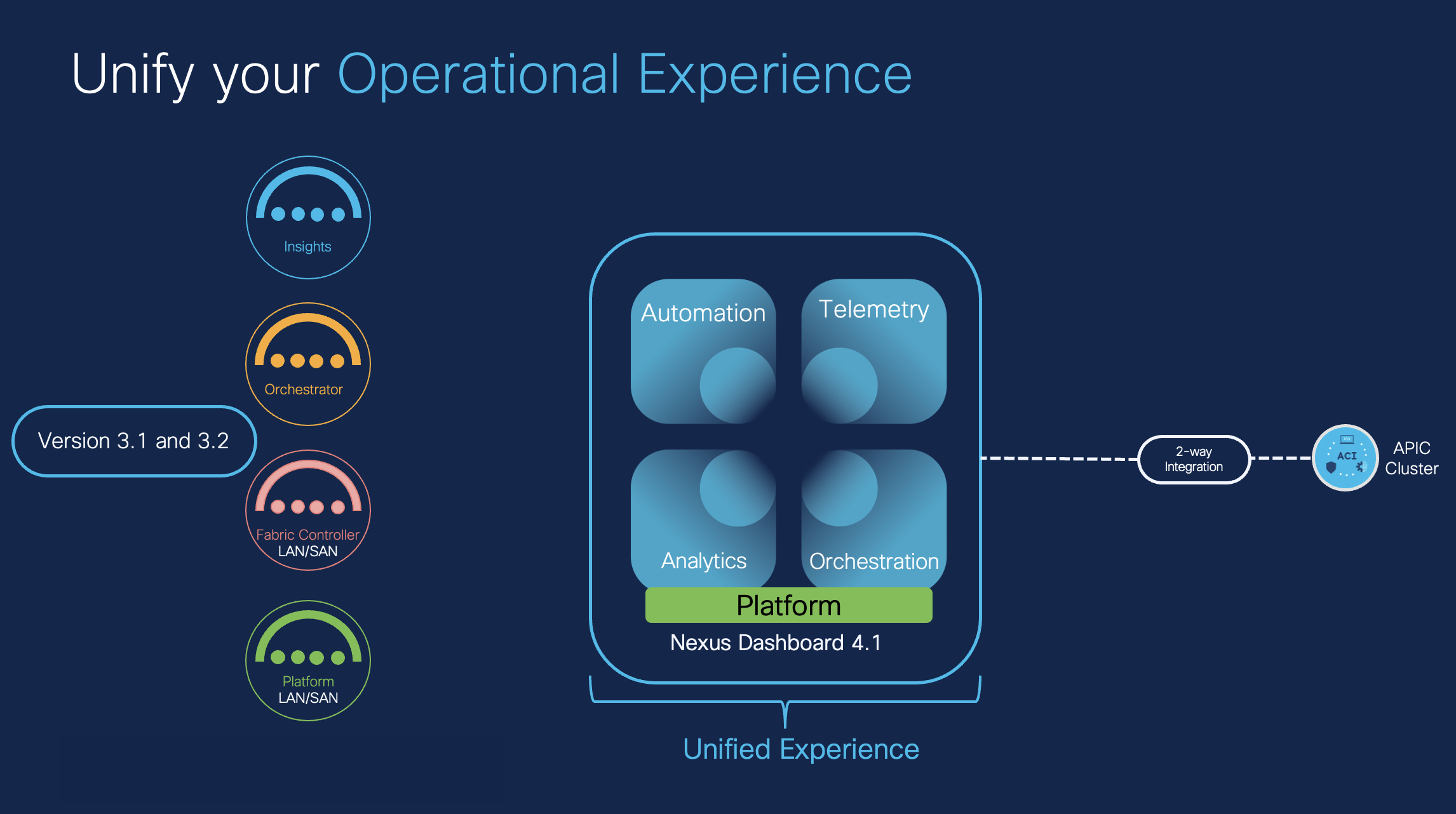 Nexus Dashboard 4.1 provides a single unified interface for complete lifecycle management of multiple data center networks. It consolidates Cisco Nexus Fabric Controller, Orchestrator, and Insights into one cohesive application with integrated navigation and API endpoints, eliminating the need to toggle between separate tools.