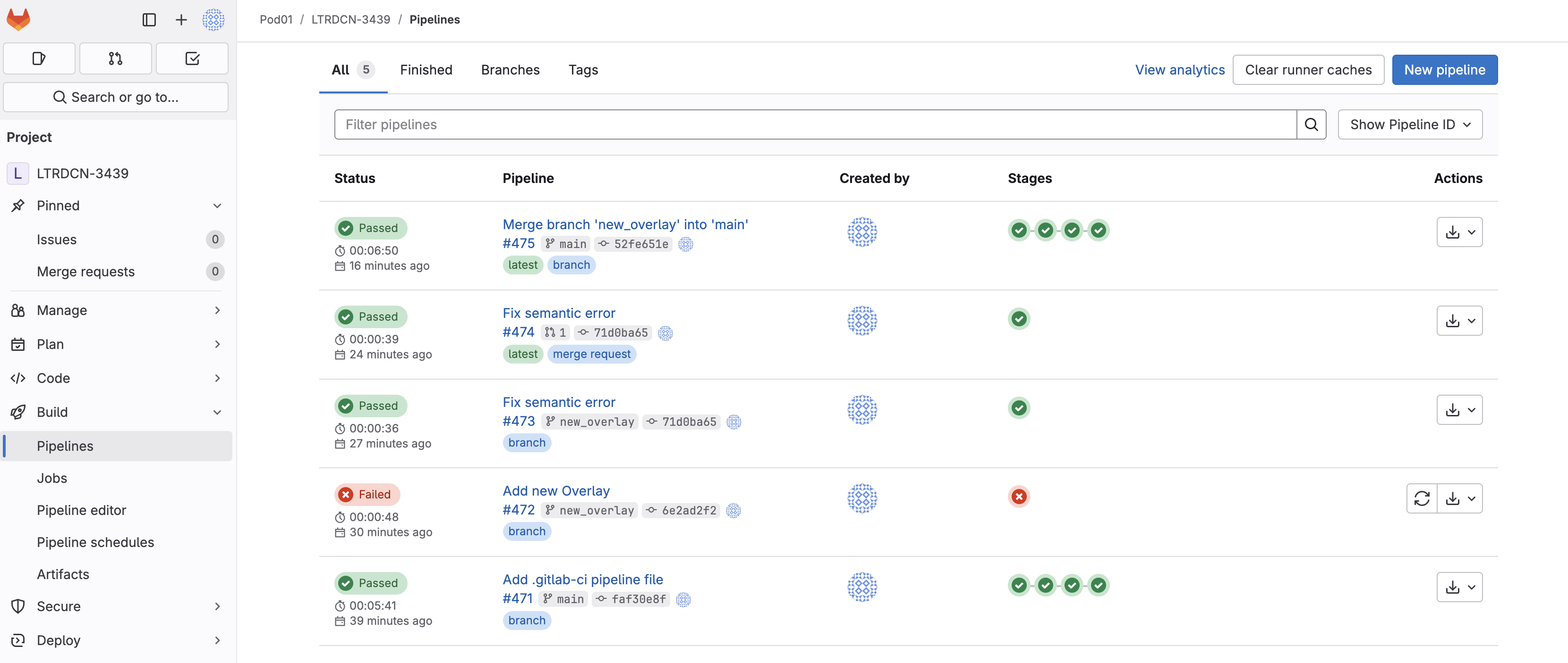 As soon as the code was committed to the new_overlay branch, Ansible Lint validation was triggered. Return to your GitLab and navigate to Pipelines:
